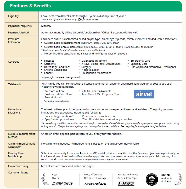 Pet insurance can help cover the veterinary costs for unexpected accidents & illnesses that you just can’t plan for. The Healthy Paws pet insurance plan covers new accidents and illnesses with customizable pricing. Choose from a variety of deductible and reimbursement options to tailor your monthly premium. With Healthy Paws’ easy-to-understand plan, you can use any licensed veterinarian in the U.S., and there are no payout limits per incident, annually or for the lifetime of the policy.